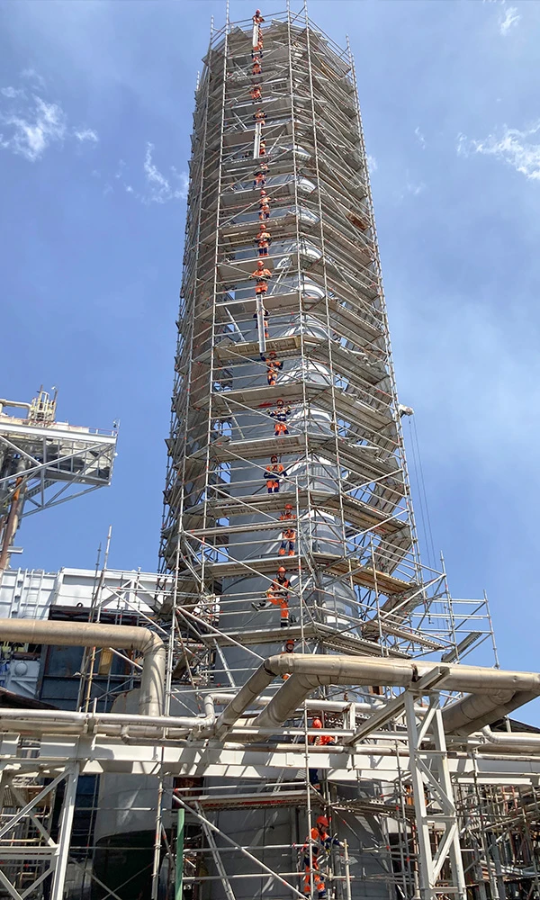 114 240На данном объекте компания «ПОЛАТИ» выполняет монтаж модульных клиновых лесов Layher. Конструкции устанавливаются снаружи и внутри аппаратов. Также сотрудники компании принимали участие в усилении металлоконструкций заграждения периметра охранной внутренней зоны служебной безопасности и выполняли аварийные работы на некоторых блоках.
